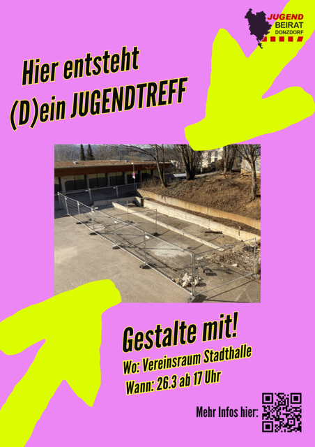 Dieser Jugendtreff soll ein Ort werden, an dem ihr euch wohlfühlt, eure Ideen einbringen und eure Freizeit gestalten könnt. Ob es um die Einrichtung, Events, oder Freizeitangebote geht – eure Meinung zählt! Gemeinsam gestalten wir einen Raum, der euren Bedürfnissen entspricht.